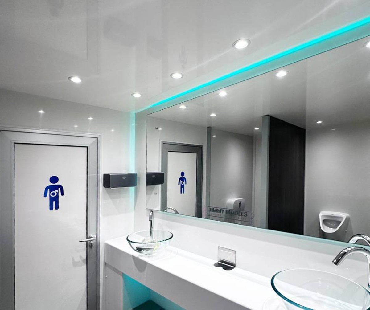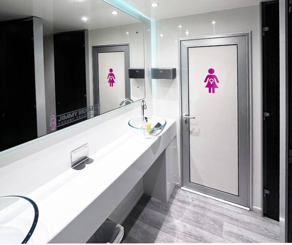 Our luxury toilet trailers boast top-end interior fittings fit for royalty. Inside, you will find white porcelain sanitary ware, glass sinks, and large mirrors. Bright interiors enhance the experience with downlighting and chrome taps. The wood-effect laminate floors add a stylish touch, while handbag and coat hooks on cubicle doors provide convenience.