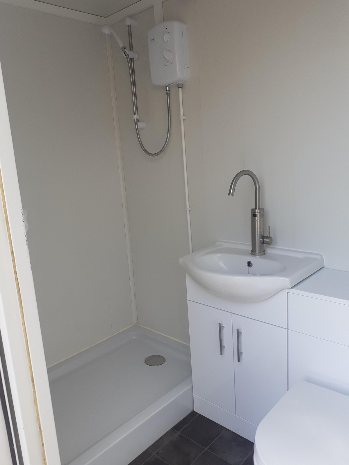 This unit requires professional connection to mains electricity and a water supply.Dimensions: 2.45m Wide x 2.1m High x (WC) 1.2m Wide