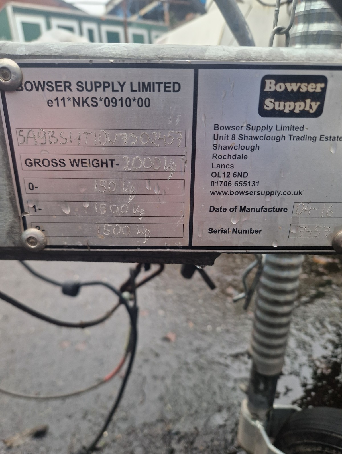 1500ltr vac tank on a twin axle trailer with water.Light use for the film industry.