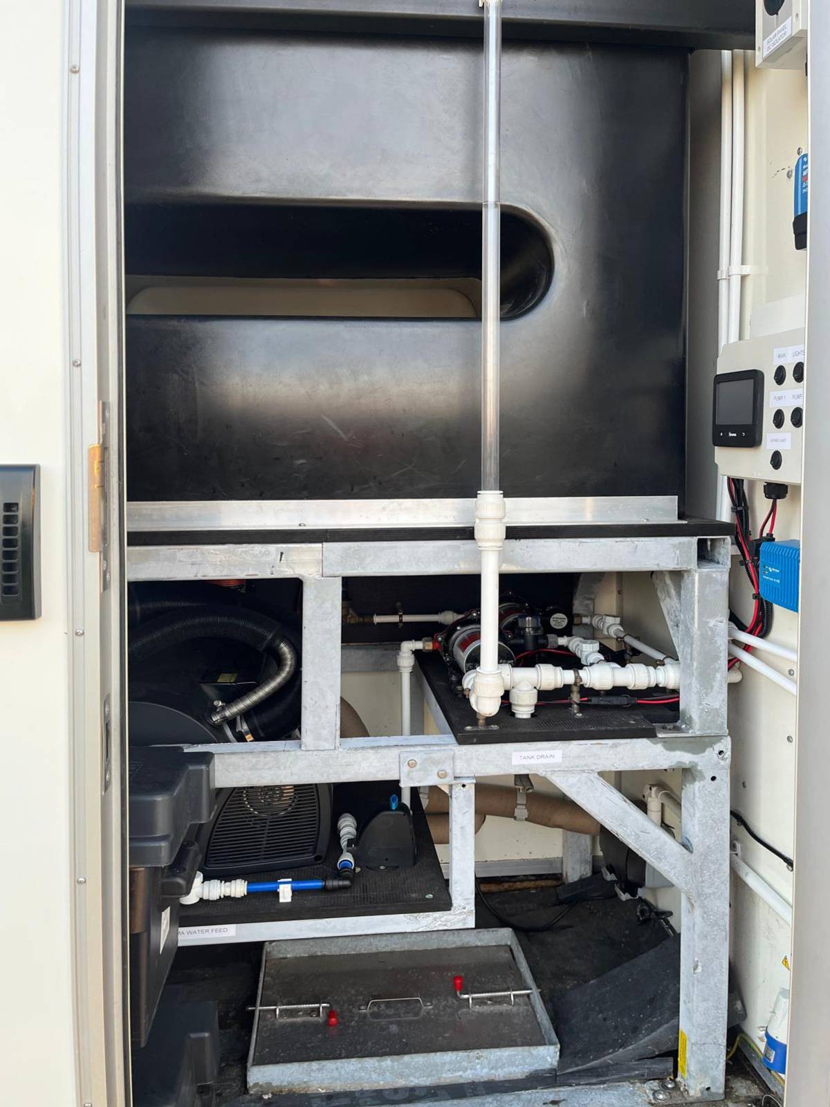 This 7 bay trailer consists of 7 separate cubicles each containing a fresh water flush toilet. Cubicles are a great size with room to move. The trailer benefits from a heater that runs on diesel or hvo this will heat up each cubicle and service area with thermostat to suit your room temperature,also heats up water system thermostat to suit.
